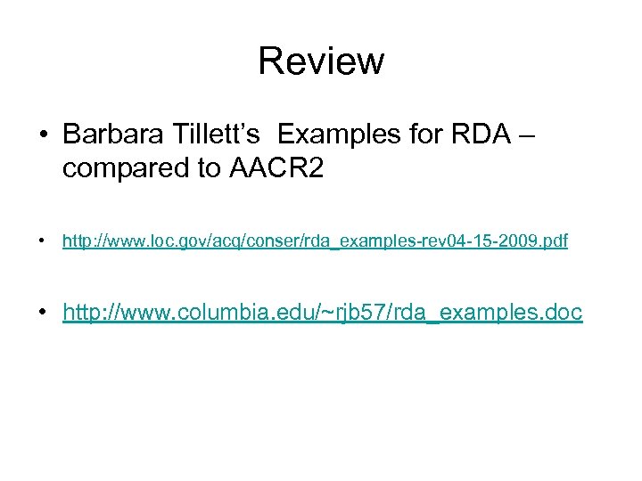 Review • Barbara Tillett’s Examples for RDA – compared to AACR 2 • http: //www. loc. gov/acq/conser/rda_examples-rev 04 -15 -2009. pdf • http: //www. columbia. edu/~rjb 57/rda_examples. doc