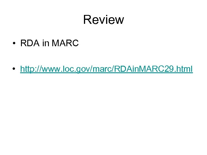 Review • RDA in MARC • http: //www. loc. gov/marc/RDAin. MARC 29. html