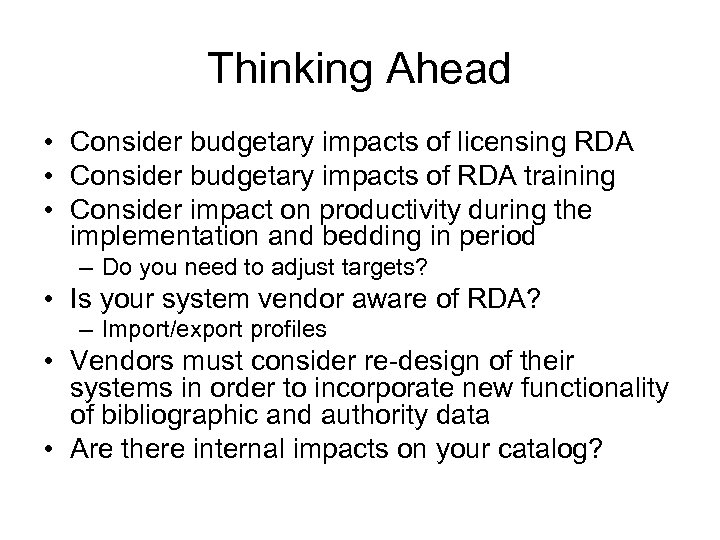 Thinking Ahead • Consider budgetary impacts of licensing RDA • Consider budgetary impacts of RDA training • Consider impact on productivity during the implementation and bedding in period – Do you need to adjust targets? • Is your system vendor aware of RDA? – Import/export profiles • Vendors must consider re-design of their systems in order to incorporate new functionality of bibliographic and authority data • Are there internal impacts on your catalog?