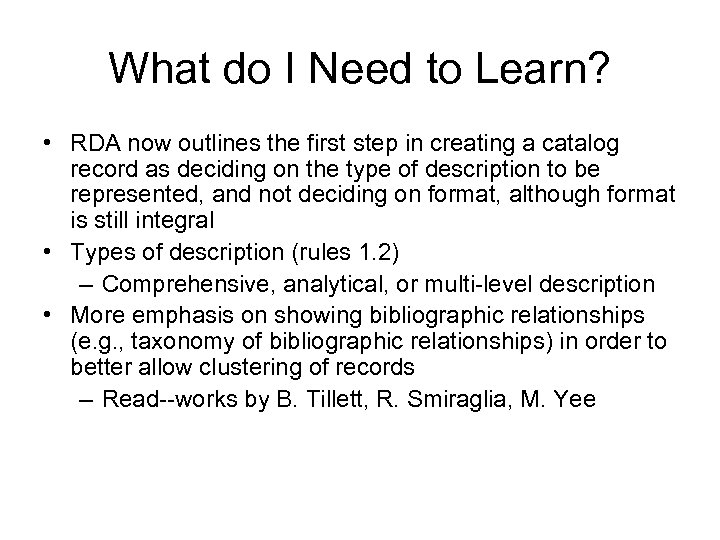 What do I Need to Learn? • RDA now outlines the first step in creating a catalog record as deciding on the type of description to be represented, and not deciding on format, although format is still integral • Types of description (rules 1. 2) – Comprehensive, analytical, or multi-level description • More emphasis on showing bibliographic relationships (e. g. , taxonomy of bibliographic relationships) in order to better allow clustering of records – Read--works by B. Tillett, R. Smiraglia, M. Yee
