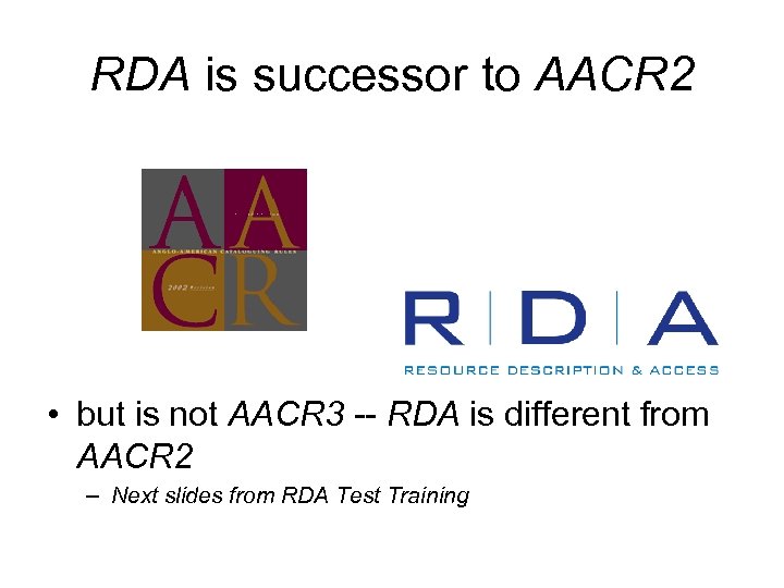 RDA is successor to AACR 2 • but is not AACR 3 -- RDA is different from AACR 2 – Next slides from RDA Test Training