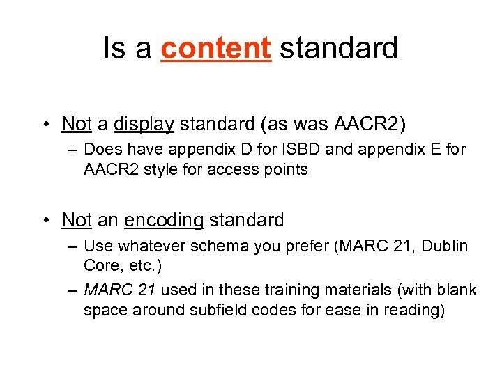 Is a content standard • Not a display standard (as was AACR 2) – Does have appendix D for ISBD and appendix E for AACR 2 style for access points • Not an encoding standard – Use whatever schema you prefer (MARC 21, Dublin Core, etc. ) – MARC 21 used in these training materials (with blank space around subfield codes for ease in reading)