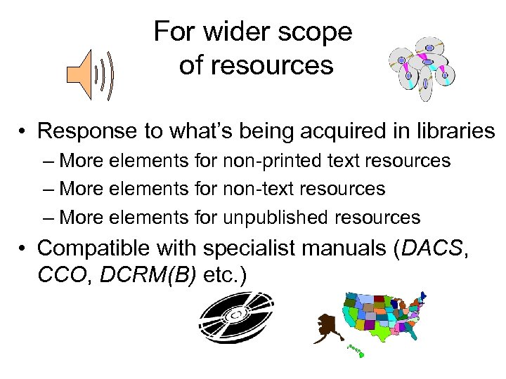 For wider scope of resources • Response to what’s being acquired in libraries – More elements for non-printed text resources – More elements for non-text resources – More elements for unpublished resources • Compatible with specialist manuals (DACS, CCO, DCRM(B) etc. )
