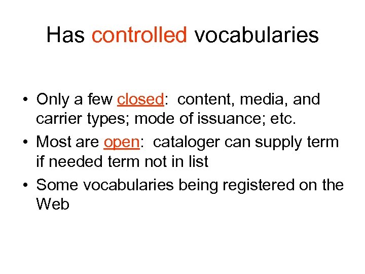 Has controlled vocabularies • Only a few closed: content, media, and carrier types; mode of issuance; etc. • Most are open: cataloger can supply term if needed term not in list • Some vocabularies being registered on the Web