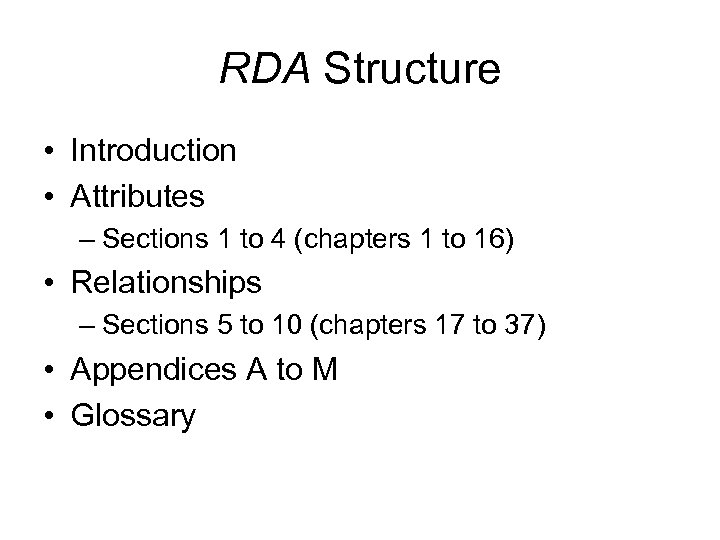 RDA Structure • Introduction • Attributes – Sections 1 to 4 (chapters 1 to 16) • Relationships – Sections 5 to 10 (chapters 17 to 37) • Appendices A to M • Glossary