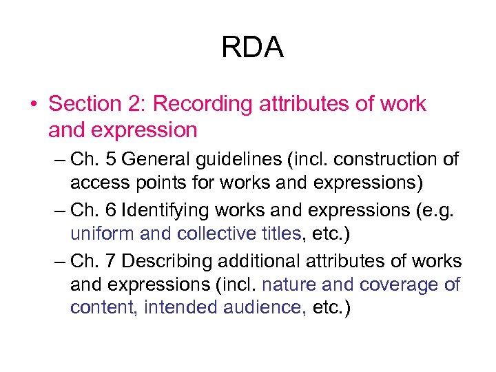 RDA • Section 2: Recording attributes of work and expression – Ch. 5 General guidelines (incl. construction of access points for works and expressions) – Ch. 6 Identifying works and expressions (e. g. uniform and collective titles, etc. ) – Ch. 7 Describing additional attributes of works and expressions (incl. nature and coverage of content, intended audience, etc. )