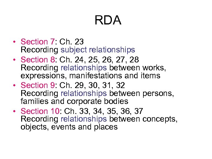 RDA • Section 7: Ch. 23 Recording subject relationships • Section 8: Ch. 24, 25, 26, 27, 28 Recording relationships between works, expressions, manifestations and items • Section 9: Ch. 29, 30, 31, 32 Recording relationships between persons, families and corporate bodies • Section 10: Ch. 33, 34, 35, 36, 37 Recording relationships between concepts, objects, events and places