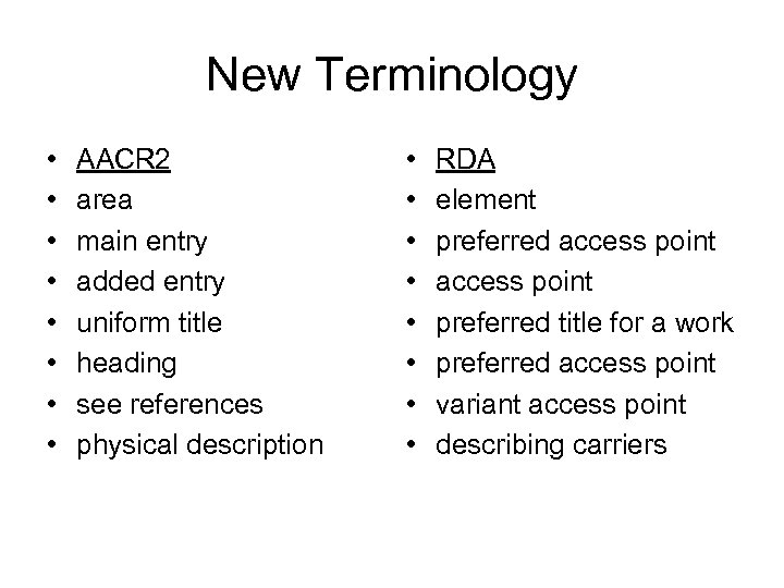 New Terminology • • AACR 2 area main entry added entry uniform title heading see references physical description • • RDA element preferred access point preferred title for a work preferred access point variant access point describing carriers