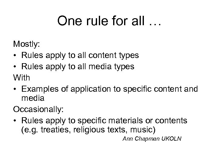 One rule for all … Mostly: • Rules apply to all content types • Rules apply to all media types With • Examples of application to specific content and media Occasionally: • Rules apply to specific materials or contents (e. g. treaties, religious texts, music) Ann Chapman UKOLN