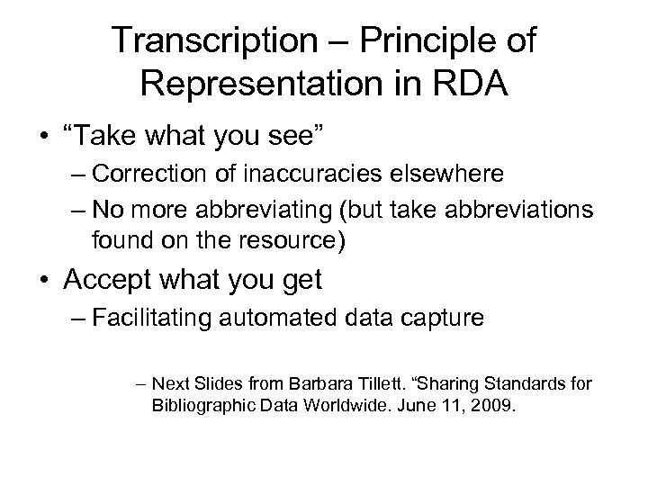 Transcription – Principle of Representation in RDA • “Take what you see” – Correction of inaccuracies elsewhere – No more abbreviating (but take abbreviations found on the resource) • Accept what you get – Facilitating automated data capture – Next Slides from Barbara Tillett. “Sharing Standards for Bibliographic Data Worldwide. June 11, 2009.