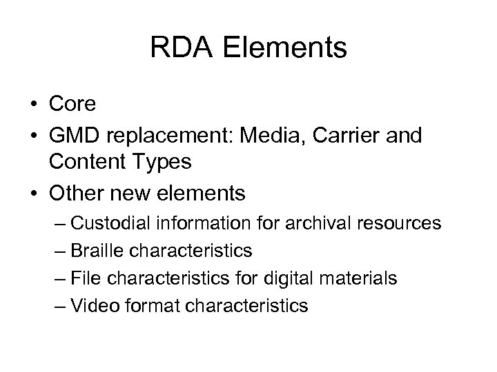 RDA Elements • Core • GMD replacement: Media, Carrier and Content Types • Other new elements – Custodial information for archival resources – Braille characteristics – File characteristics for digital materials – Video format characteristics