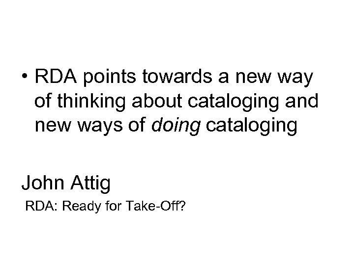• RDA points towards a new way of thinking about cataloging and new ways of doing cataloging John Attig RDA: Ready for Take-Off?