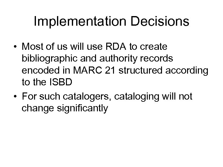 Implementation Decisions • Most of us will use RDA to create bibliographic and authority records encoded in MARC 21 structured according to the ISBD • For such catalogers, cataloging will not change significantly