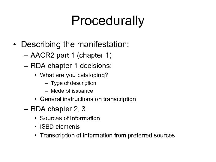 Procedurally • Describing the manifestation: – AACR 2 part 1 (chapter 1) – RDA chapter 1 decisions: • What are you cataloging? – Type of description – Mode of issuance • General instructions on transcription – RDA chapter 2, 3: • Sources of information • ISBD elements • Transcription of information from preferred sources