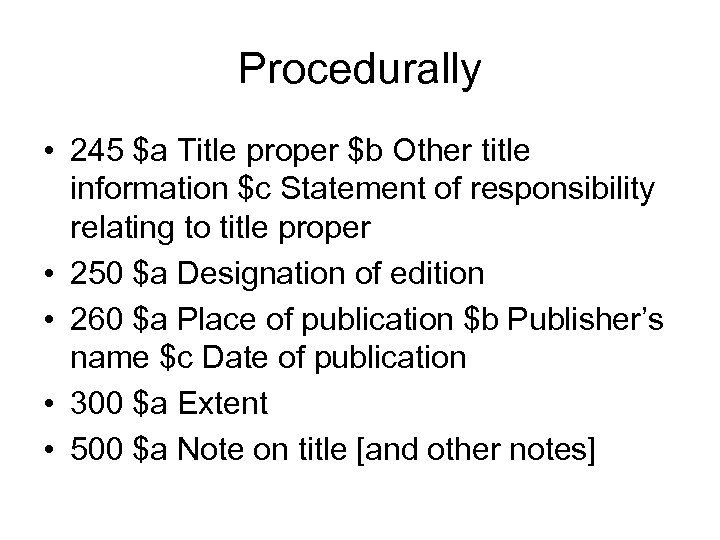 Procedurally • 245 $a Title proper $b Other title information $c Statement of responsibility relating to title proper • 250 $a Designation of edition • 260 $a Place of publication $b Publisher’s name $c Date of publication • 300 $a Extent • 500 $a Note on title [and other notes]