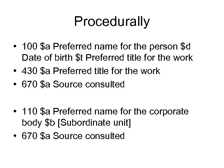 Procedurally • 100 $a Preferred name for the person $d Date of birth $t Preferred title for the work • 430 $a Preferred title for the work • 670 $a Source consulted • 110 $a Preferred name for the corporate body $b [Subordinate unit] • 670 $a Source consulted