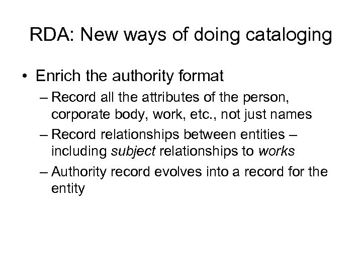RDA: New ways of doing cataloging • Enrich the authority format – Record all the attributes of the person, corporate body, work, etc. , not just names – Record relationships between entities – including subject relationships to works – Authority record evolves into a record for the entity