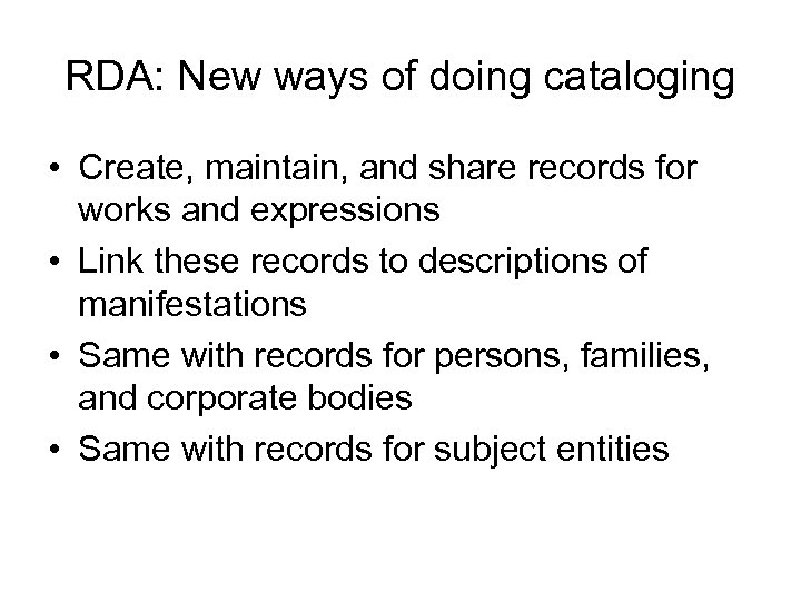 RDA: New ways of doing cataloging • Create, maintain, and share records for works and expressions • Link these records to descriptions of manifestations • Same with records for persons, families, and corporate bodies • Same with records for subject entities