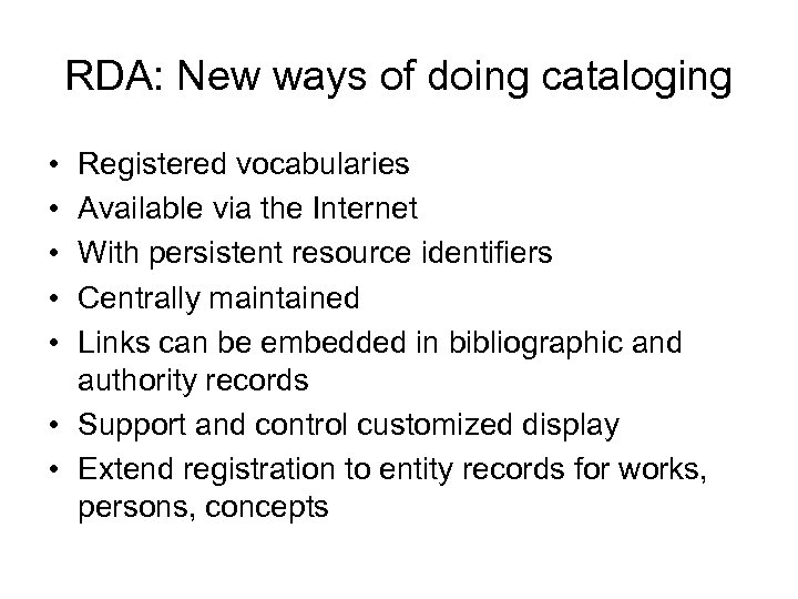 RDA: New ways of doing cataloging • • • Registered vocabularies Available via the Internet With persistent resource identifiers Centrally maintained Links can be embedded in bibliographic and authority records • Support and control customized display • Extend registration to entity records for works, persons, concepts