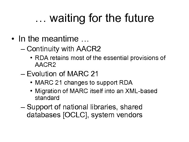 … waiting for the future • In the meantime … – Continuity with AACR 2 • RDA retains most of the essential provisions of AACR 2 – Evolution of MARC 21 • MARC 21 changes to support RDA • Migration of MARC itself into an XML-based standard – Support of national libraries, shared databases [OCLC], system vendors