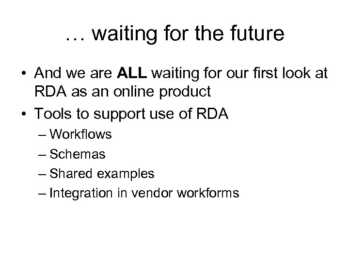 … waiting for the future • And we are ALL waiting for our first look at RDA as an online product • Tools to support use of RDA – Workflows – Schemas – Shared examples – Integration in vendor workforms