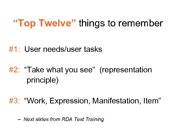 “Top Twelve” things to remember #1: User needs/user tasks #2: “Take what you see” (representation principle) #3: “Work, Expression, Manifestation, Item” – Next slides from RDA Test Training