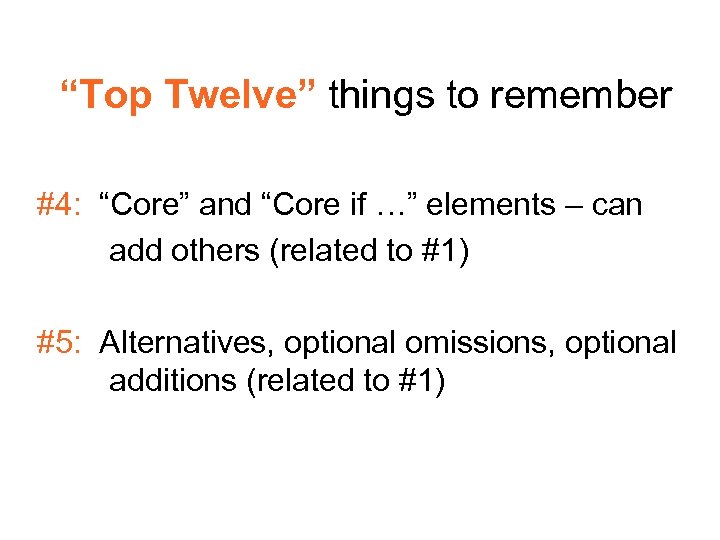 “Top Twelve” things to remember #4: “Core” and “Core if …” elements – can add others (related to #1) #5: Alternatives, optional omissions, optional additions (related to #1)