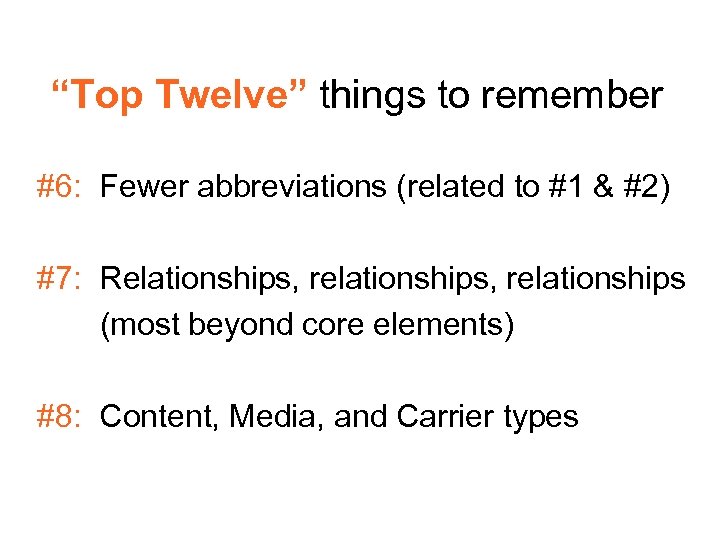 “Top Twelve” things to remember #6: Fewer abbreviations (related to #1 & #2) #7: Relationships, relationships (most beyond core elements) #8: Content, Media, and Carrier types