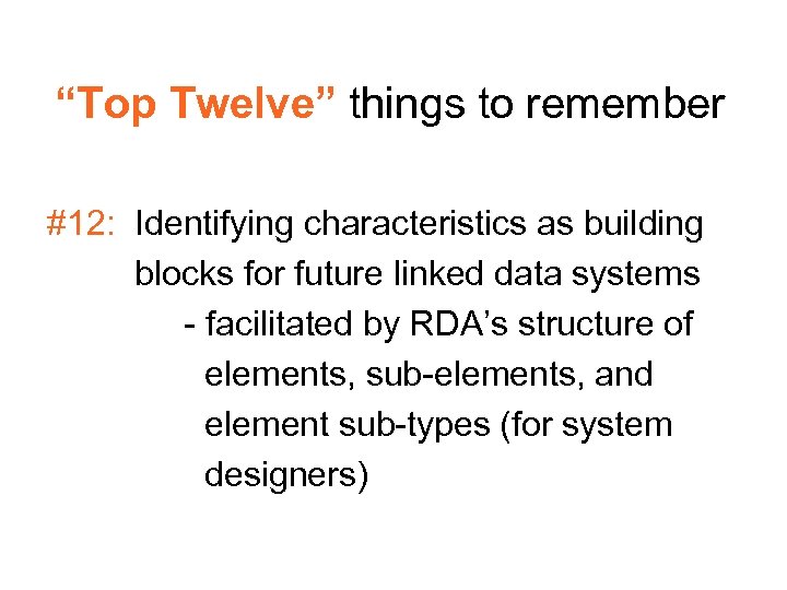 “Top Twelve” things to remember #12: Identifying characteristics as building blocks for future linked data systems - facilitated by RDA’s structure of elements, sub-elements, and element sub-types (for system designers)