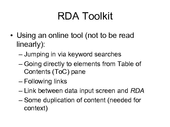 RDA Toolkit • Using an online tool (not to be read linearly): – Jumping in via keyword searches – Going directly to elements from Table of Contents (To. C) pane – Following links – Link between data input screen and RDA – Some duplication of content (needed for context)