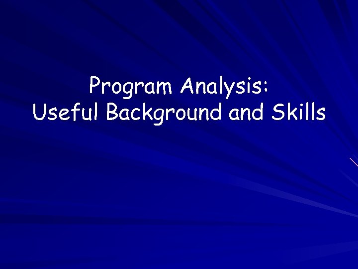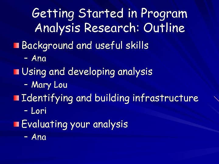 Getting Started in Program Analysis Research: Outline Background and useful skills – Ana Using and developing analysis – Mary Lou Identifying and building infrastructure – Lori Evaluating your analysis – Ana