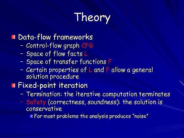Theory Data-flow frameworks – – Control-flow graph CFG Space of flow facts L Space of transfer functions F Certain properties of L and F allow a general solution procedure Fixed-point iteration – – Termination: the iterative computation terminates Safety (correctness, soundness): the solution is conservative For most problems the analysis produces “noise”