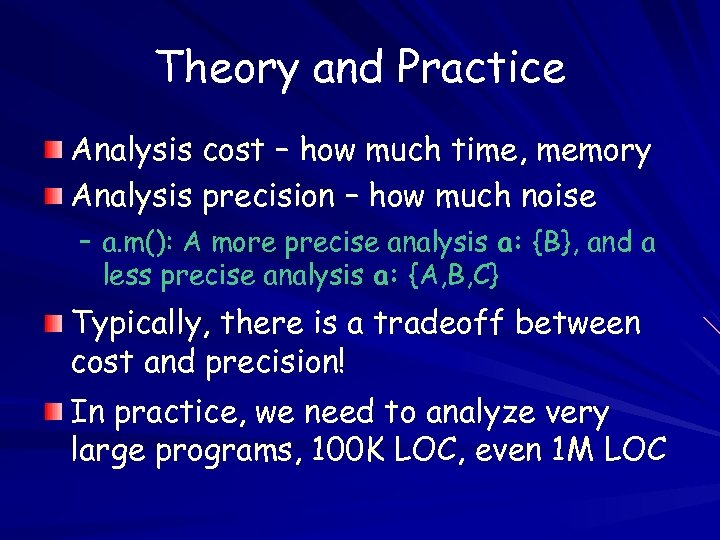 Theory and Practice Analysis cost – how much time, memory Analysis precision – how much noise – a. m(): A more precise analysis a: {B}, and a less precise analysis a: {A, B, C} Typically, there is a tradeoff between cost and precision! In practice, we need to analyze very large programs, 100 K LOC, even 1 M LOC