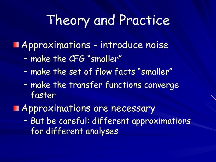 Theory and Practice Approximations - introduce noise – make the CFG “smaller” – make the set of flow facts “smaller” – make the transfer functions converge faster Approximations are necessary – But be careful: different approximations for different analyses