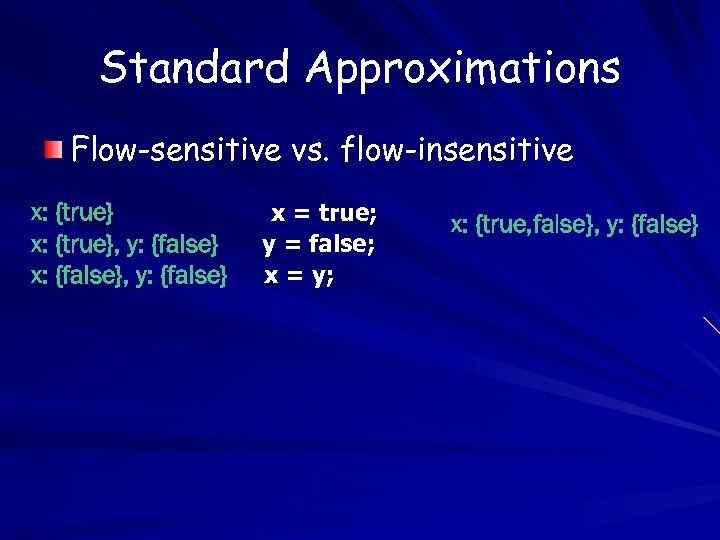 Standard Approximations Flow-sensitive vs. flow-insensitive x: {true}, y: {false} x: {false}, y: {false} x = true; y = false; x = y; x: {true, false}, y: {false}