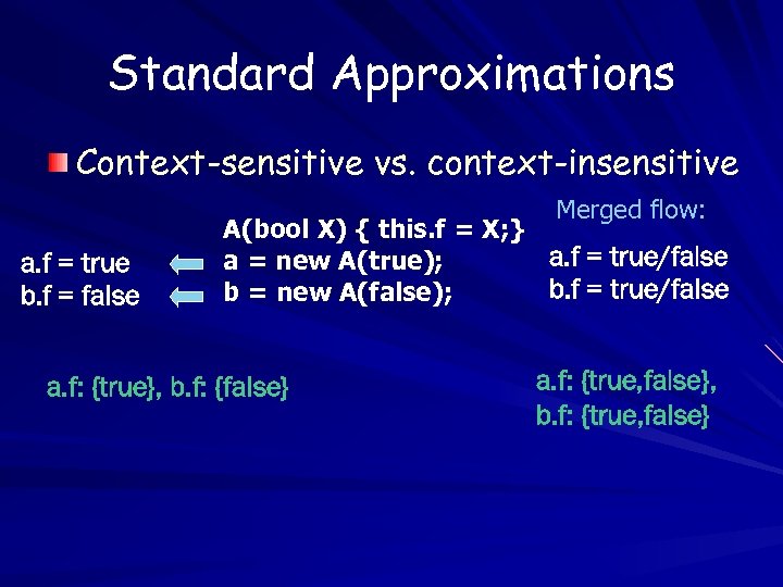 Standard Approximations Context-sensitive vs. context-insensitive Merged flow: a. f = true b. f = false A(bool X) { this. f = X; } a. f = true/false a = new A(true); b. f = true/false b = new A(false); a. f: {true}, b. f: {false} a. f: {true, false}, b. f: {true, false}