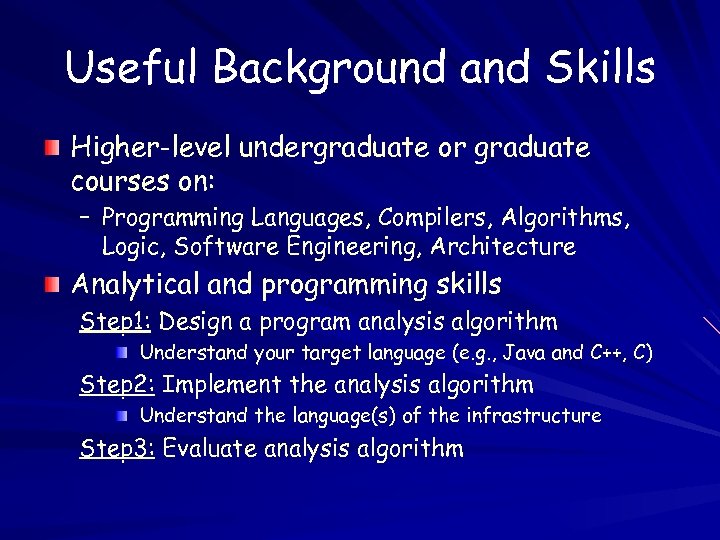 Useful Background and Skills Higher-level undergraduate or graduate courses on: – Programming Languages, Compilers, Algorithms, Logic, Software Engineering, Architecture Analytical and programming skills Step 1: Design a program analysis algorithm Understand your target language (e. g. , Java and C++, C) Step 2: Implement the analysis algorithm Understand the language(s) of the infrastructure Step 3: Evaluate analysis algorithm
