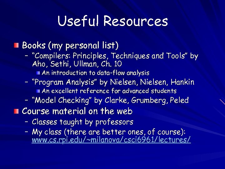 Useful Resources Books (my personal list) – “Compilers: Principles, Techniques and Tools” by Aho, Sethi, Ullman, Ch. 10 An introduction to data-flow analysis – “Program Analysis” by Nielsen, Hankin An excellent reference for advanced students – “Model Checking” by Clarke, Grumberg, Peled Course material on the web – Classes taught by professors – My class (there are better ones, of course): www. cs. rpi. edu/~milanova/csci 6961/lectures/