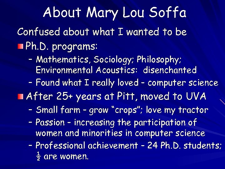 About Mary Lou Soffa Confused about what I wanted to be Ph. D. programs: – Mathematics, Sociology; Philosophy; Environmental Acoustics: disenchanted – Found what I really loved – computer science After 25+ years at Pitt, moved to UVA – Small farm – grow “crops”; love my tractor – Passion – increasing the participation of women and minorities in computer science – Professional achievement – 24 Ph. D. students; ½ are women.