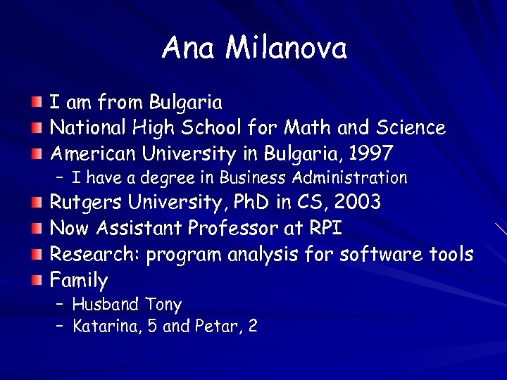 Ana Milanova I am from Bulgaria National High School for Math and Science American University in Bulgaria, 1997 – I have a degree in Business Administration Rutgers University, Ph. D in CS, 2003 Now Assistant Professor at RPI Research: program analysis for software tools Family – – Husband Tony Katarina, 5 and Petar, 2