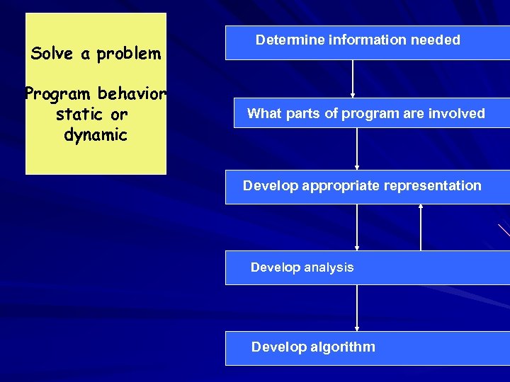 Solve a problem Program behavior static or dynamic Determine information needed What parts of program are involved Develop appropriate representation Develop analysis Develop algorithm