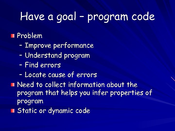 Have a goal – program code Problem – Improve performance – Understand program – Find errors – Locate cause of errors Need to collect information about the program that helps you infer properties of program Static or dynamic code