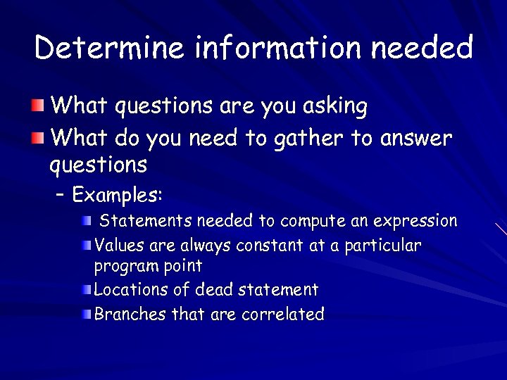 Determine information needed What questions are you asking What do you need to gather to answer questions – Examples: Statements needed to compute an expression Values are always constant at a particular program point Locations of dead statement Branches that are correlated
