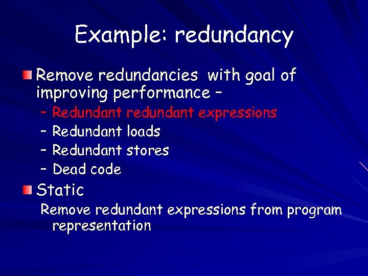 Example: redundancy Remove redundancies with goal of improving performance – – Redundant redundant expressions – Redundant loads – Redundant stores – Dead code Static Remove redundant expressions from program representation