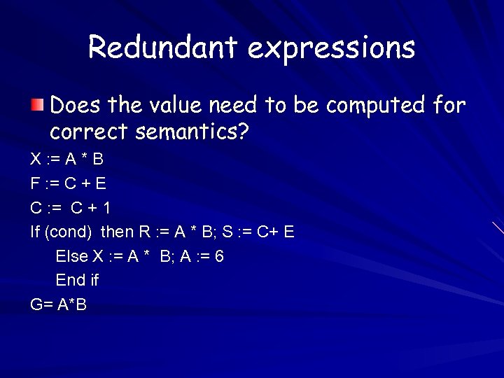 Redundant expressions Does the value need to be computed for correct semantics? X : = A * B F : = C + E C : = C + 1 If (cond) then R : = A * B; S : = C+ E Else X : = A * B; A : = 6 End if G= A*B