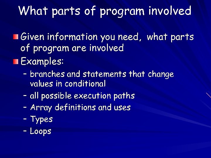 What parts of program involved Given information you need, what parts of program are involved Examples: – branches and statements that change values in conditional – all possible execution paths – Array definitions and uses – Types – Loops