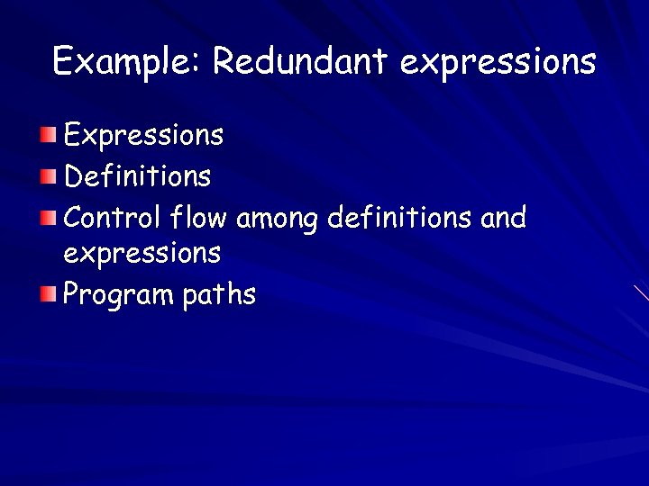 Example: Redundant expressions Expressions Definitions Control flow among definitions and expressions Program paths