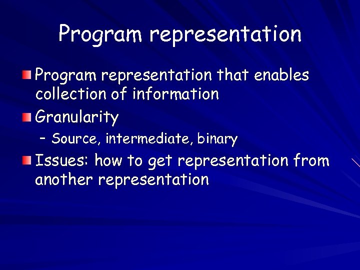 Program representation that enables collection of information Granularity – Source, intermediate, binary Issues: how to get representation from another representation