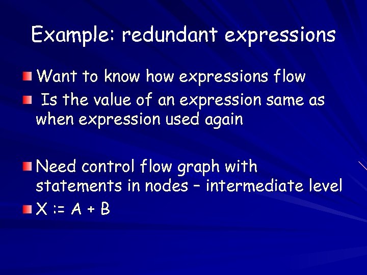 Example: redundant expressions Want to know how expressions flow Is the value of an expression same as when expression used again Need control flow graph with statements in nodes – intermediate level X : = A + B