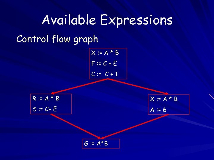 Available Expressions Control flow graph X : = A * B F : = C + E C : = C + 1 R : = A * B X : = A * B S : = C+ E A : = 6 G : = A*B